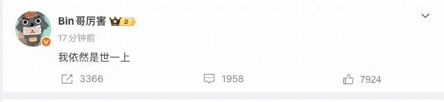 北京时间2月6日,LPL电竞春晚落下帷幕,BLG遭到AL让一追二,以登峰组第二的身份结束了组内赛的争夺。本场比赛结束后,BLG上单Bin选手更新了微博,内容是:“我依然是世一上。”